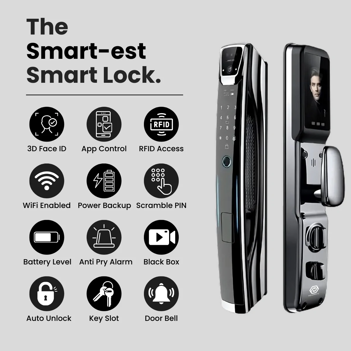 Introducing Houzmatic’s Alpha 3, a cutting-edge smart door lock featuring a state-of-the-art facial scanner that guarantees unparalleled security when entering your home. Elevate your home’s aesthetic and safety with this sleek, black-finished lock, crafted from high-quality zinc alloy materials to complement your door’s veneer or grain pattern. The Alpha 3 offers a range of advanced features, including support for up to 300 fingerprint IDs, 100 IC cards, and personalized PIN codes, ensuring that every member of your household has secure and convenient access.